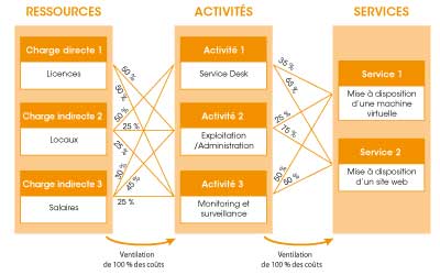 Le principe est simple, on cherche donc à réattribuer les charges indirectes via une clé de répartition sur les centres d’analyse principaux. Les charges indirectes ainsi ré-imputées sont ensuite rajoutées aux charges directes pour obtenir le coût de revient de l’activité.